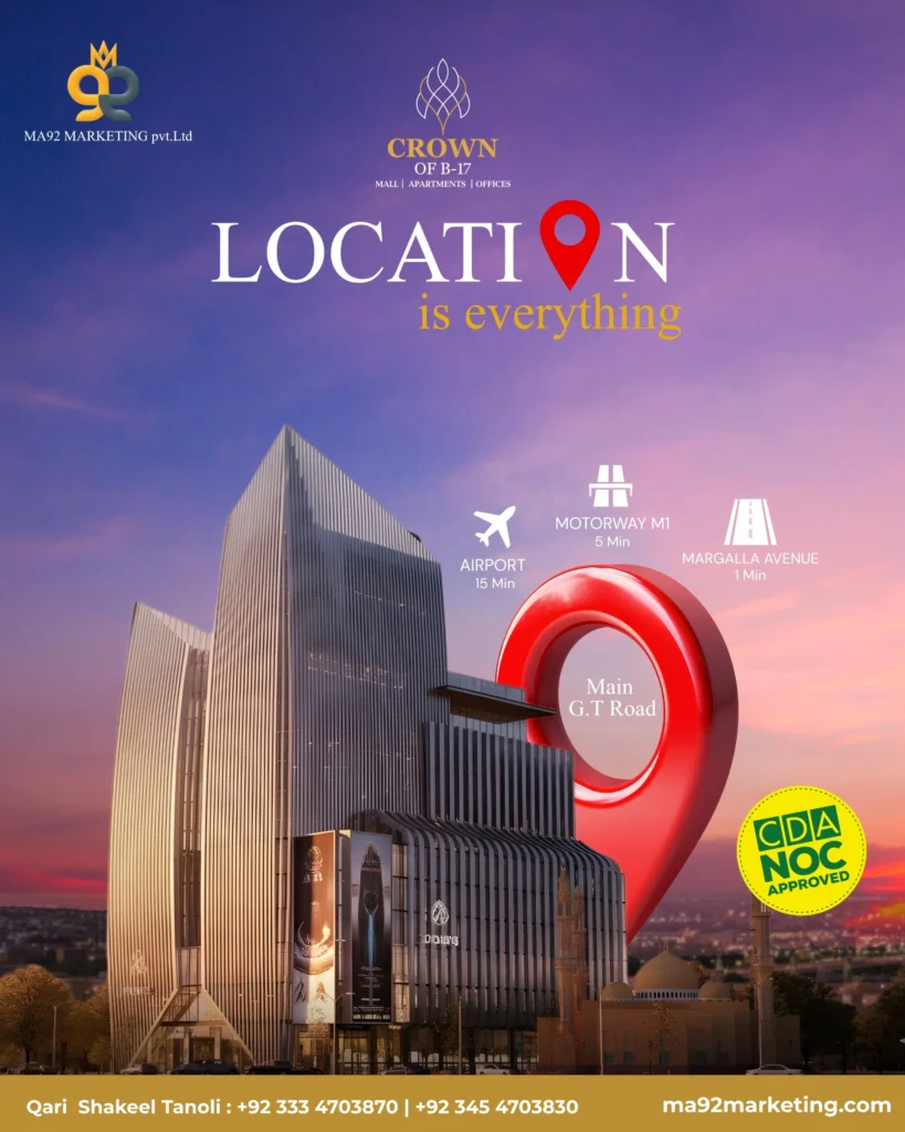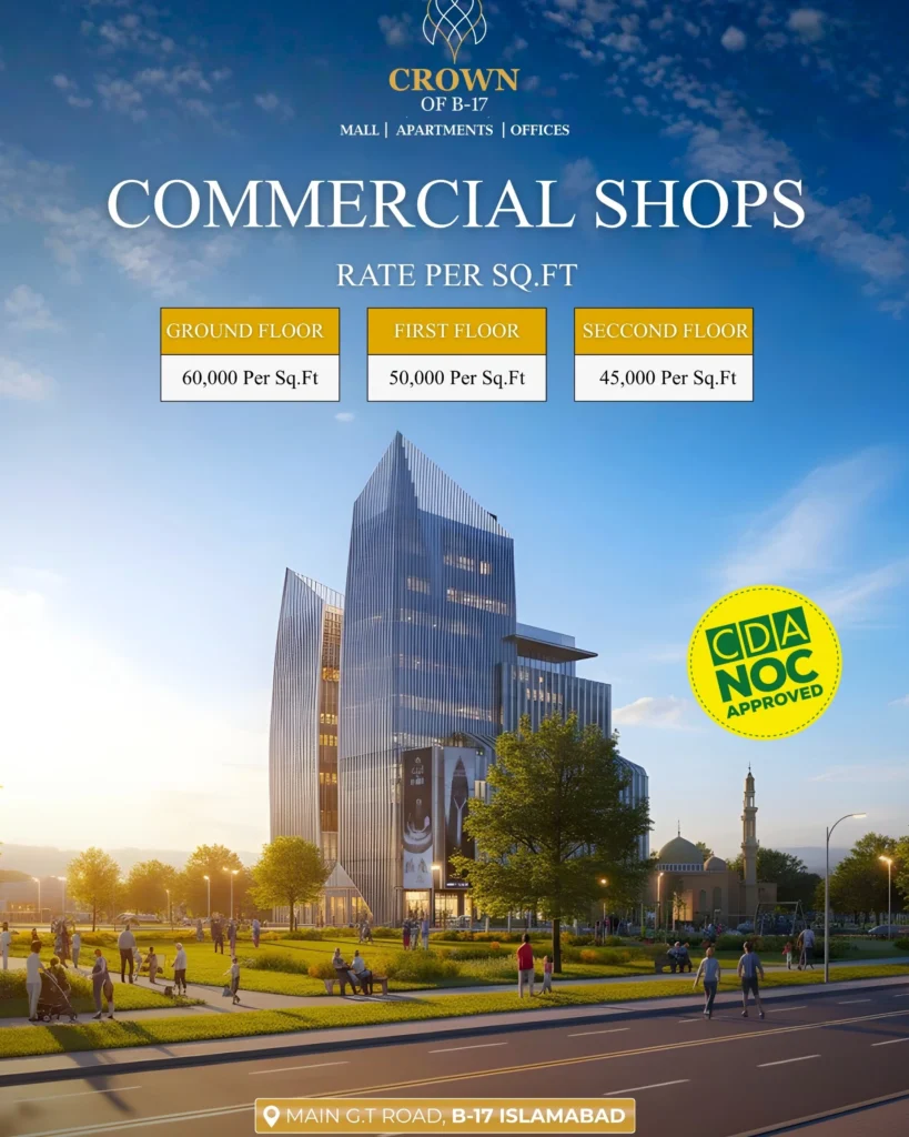 The real estate landscape of B-17 Multi Gardens, Islamabad is evolving, and the CROWN of B-17 stands at the forefront of this transformation. More than just a building, this mixed-use tower is a lifestyle destination, offering premium Luxury Flats Islamabad and strategically located commercial units within the coveted CDA-approved sector. It is meticulously designed to cater to modern families seeking comfort and businesses looking for prime foot traffic.