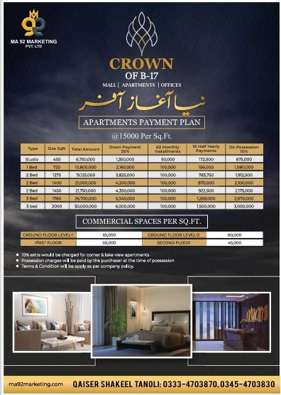 By combining an unbeatable price point (starting at 15,000 per sq ft), strategic location in a CDA Approved Society, and an array of premium amenities, the CROWN of B-17 is the most compelling investment opportunity in B-17 Multi Gardens today.